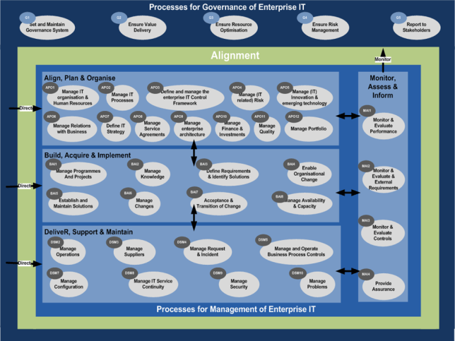 Funcţia IT (operarea) este inclusă în cadrul guvernării entităţii în timp ce serviciile, aplicaţiile, infrastructura şi celelalte active sînt incluse în “guvernarea activelor” (ceea ce apare în ITIL Service asset and Configuration Management?). După cum se vede din imaginea anterioară, aceste aspecte sînt considerate “funcţionale” şi vizează eficienţa şi eficacitatea operării IT.