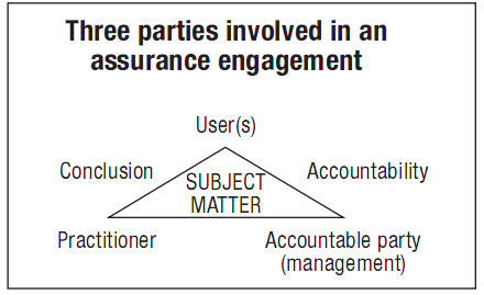 Să reformulăm: partea responsabilă sau însărcinată (managementul) face anumite declaraţii cu privire la subiectul analizat. Credibilitate sau asigurări cu privire la declaraţiile realizate de către cel resposanbil sunt oferite de către “assurer”. Iar asigurările acestea sunt oferite în folosul utilizatorilor.