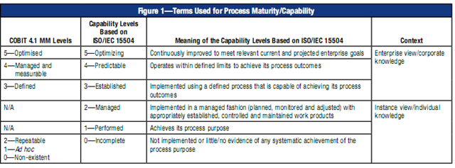 De curând ISACA a publicat COBIT Process Assessment Model (PAM): Using COBIT® 4.1,(acces doar pentru membrii ISACA) document ce pune în acord COBIT 4.1 şi ISO 15504. În COBIT 4.1 aveam evaluarea maturităţii proceselor, dar lucrurile nu păreau suficient de clare şi exista destul de mult subiectivism.