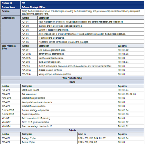 Scopul procesului este derivat din cerinţele economice pe care procesul IT trebuie să le satisfacă. Rezultatele procesului derivă din “obiectivele” prezentate în COBIT 4.1. Practicile de bază corespund activităţilor din matricea RACI iar produsul muncii este dat de intrările şi ieşirile procesului.