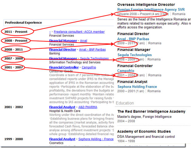 Aceleaşi informaţii, asociate aceluiaş nume/profil linkedin se regăsesc şi prin alte locuri/reţele sociale (cu menţiunea că par mai actuale), cu mici diferenţe. O fi doar o coincidenţă de nume şi poziţii deţinute?