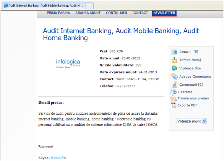 Pretul pe care l-ai vazut tu acolo pe site, este pretul pentru o ora-om. Nu se poate face un pret standard pentru un serviciu de audit. Daca ai fi avut vreo tangenta cu serviciile profesionale ti-ai fi dat seama de acest lucru. Cei peste 50 de clienti pe care i-am deservit in ultimii 8 ani cu Infologica au alta parere despre serviciile mele de audit, la fel si ISACA International care mi-a dat de mai multe ori recunoasterea de „ISACA Certificate of Appreciation”. Sunt singurul roman care a contribuit la manualul de audit editat de ISACA, CISA Review Manual. I-a orice editie din 2008 pana in prezent si o sa vezi numele meu acolo, si in fiecare an ISACA accepta intrebarile mele pentru examenul de audit. Tocmai m-au informat ca mi-au acceptat 2 intrebari pentru examenul de la anul, 2012. Ma surprinde ca un profesionist ca tine face astfel de aprecieri, mai ales ca am lucrat impreuna.Imi pare rau pentru tine, si pentru ce ai ajuns. Sincer.