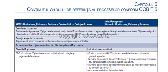 A doua referinţă este procesul EÎM03 – Asigură optimizarea riscurilor. Pentru fiecare proces “activităţile din COBIT 5 indică cum, de ce şi ce să se pună în aplicare pentru fiecare practică de guvernare sau management pentru a îmbunătăţi performanţa IT și/sau a aborda soluţii IT si riscurile furnizării serviciilor” (COBIT 5 Procese catalizatoare, pg. 20)![]()