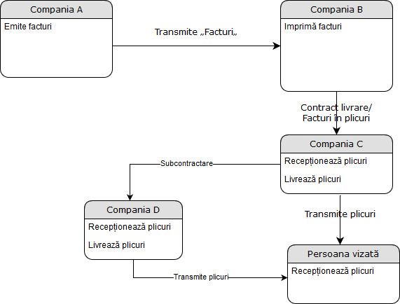 În schemă am scris „livrează plicuri„ și nu „livrează facturi„ pentru că nu avem cunoștință dacă în orice plic de la furnizor este o factură sau altceva: o informare, o înștiințare etc.