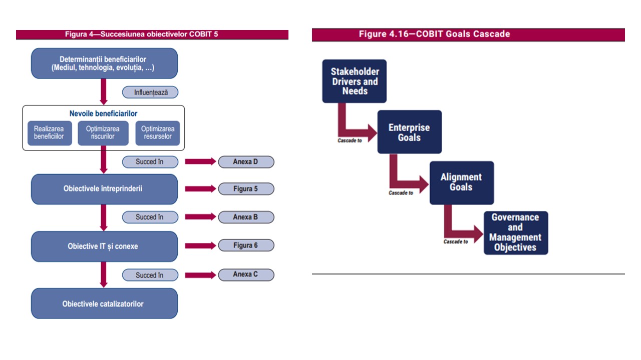 - „design factors„ – factorii care influențează proiectarea sistemului de guvernare (strategie, obiective, profilul riscului, IT, amenințări, cerințe de conformitate, model de finanțare a IT, metode de implementare IT, dimensiunea organizației…)